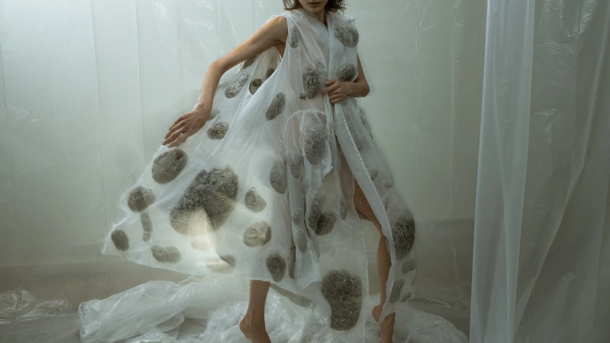 THE COAGULATED SILK PUFFERS WERE CREATED UTILIZING SCRAP REMNANTS FROM THE PRODUCTION OF COLLECTION 1, AND SILK THAT ENCASES FRAGMENTED DESIGNS CONCEPTS FROM COLLECTION TWO, AND WERE NATURALLY DYED BY HAND.