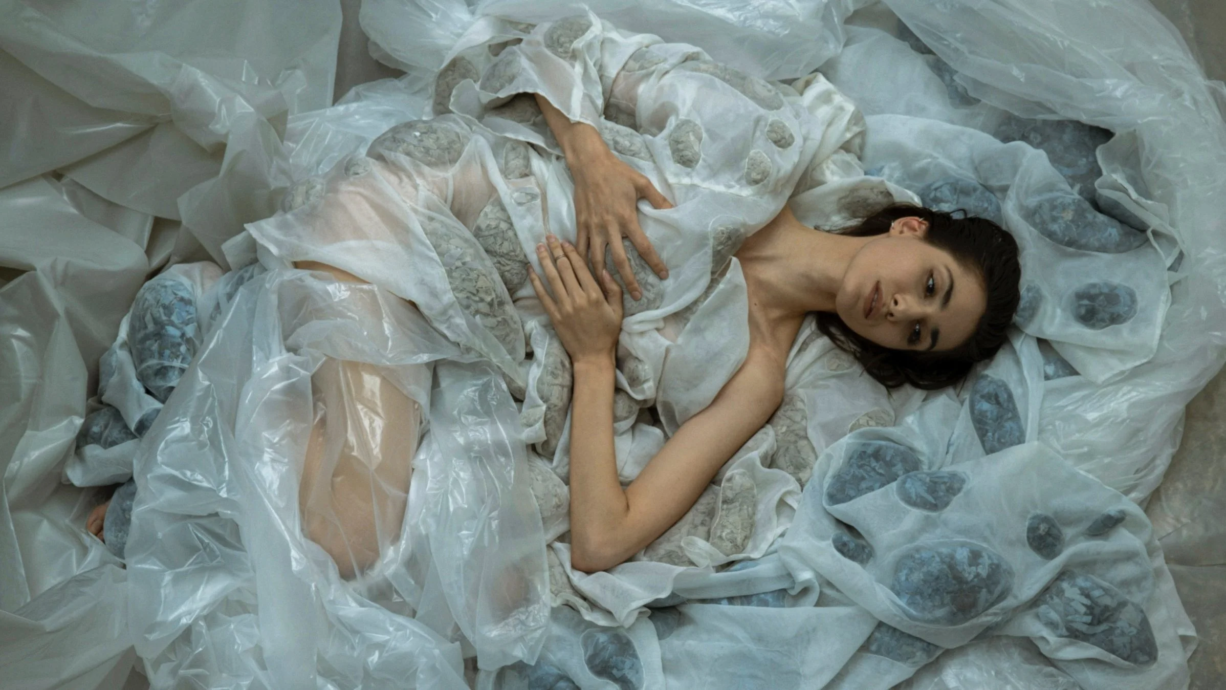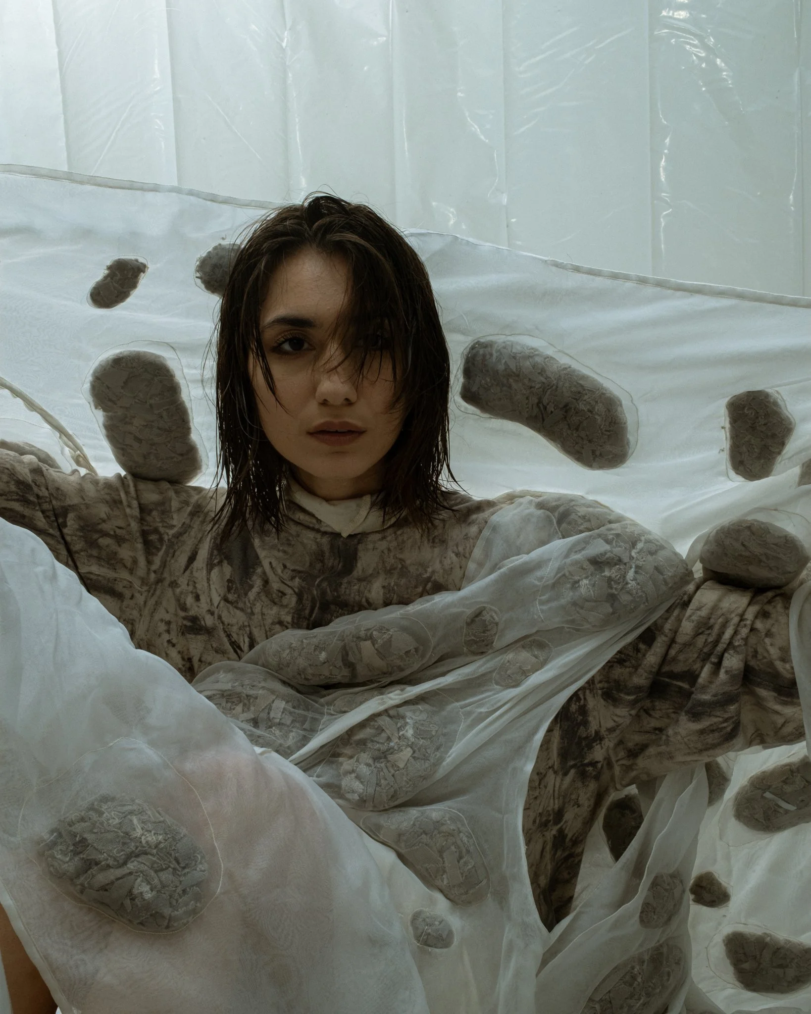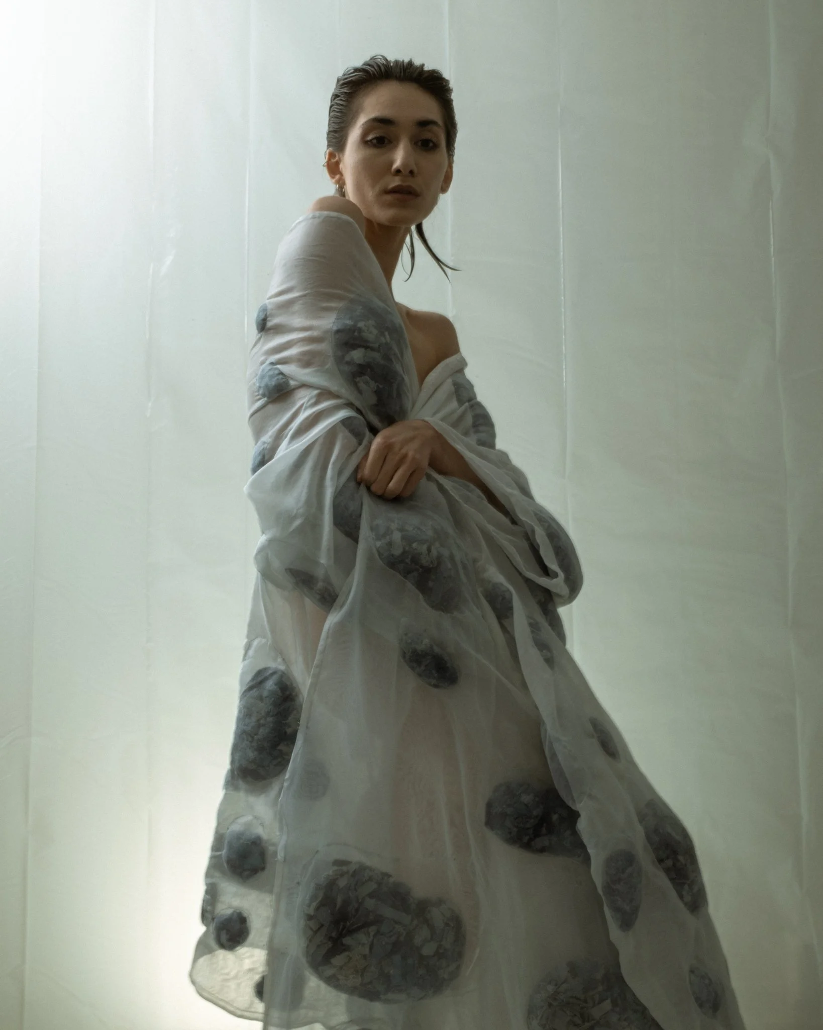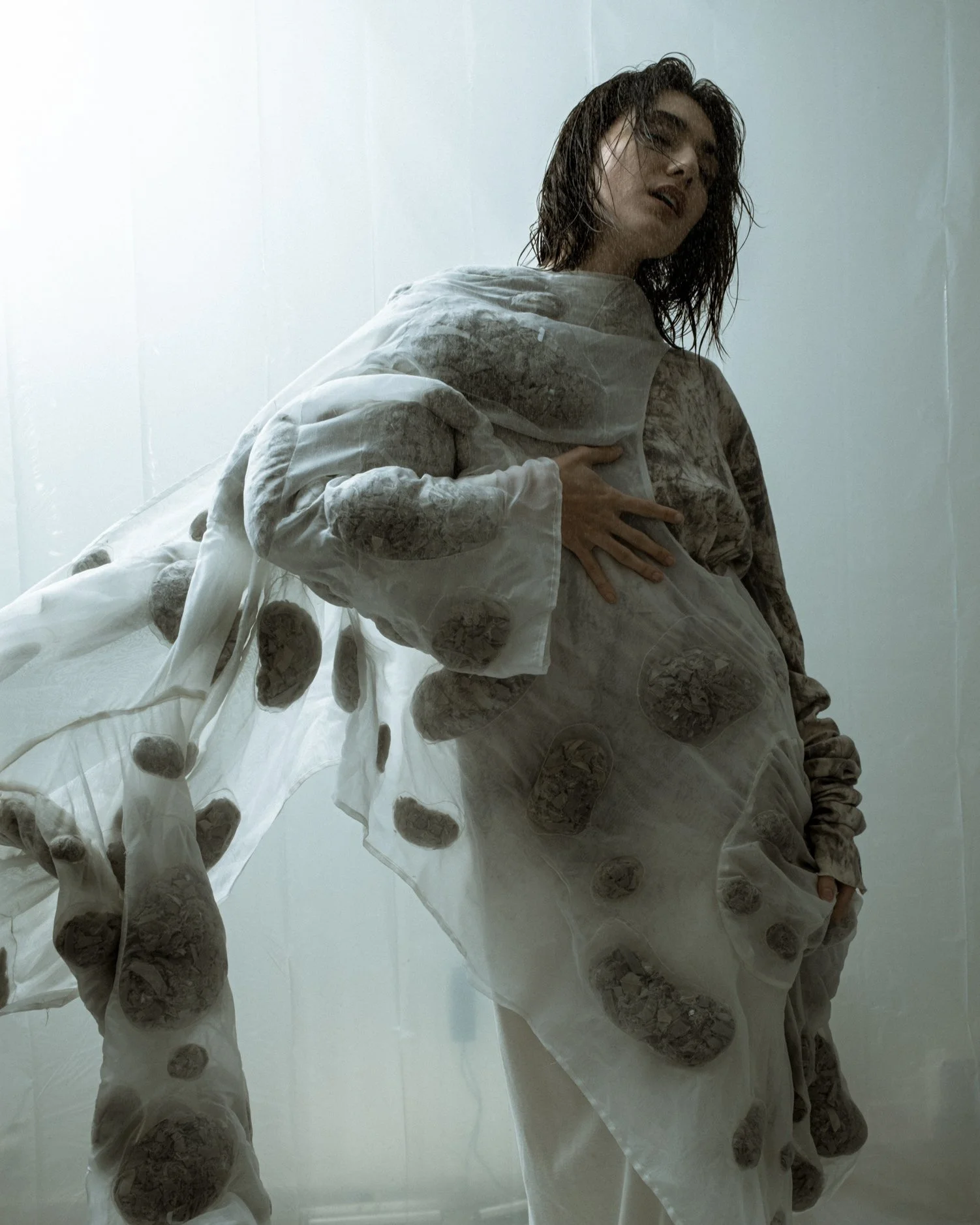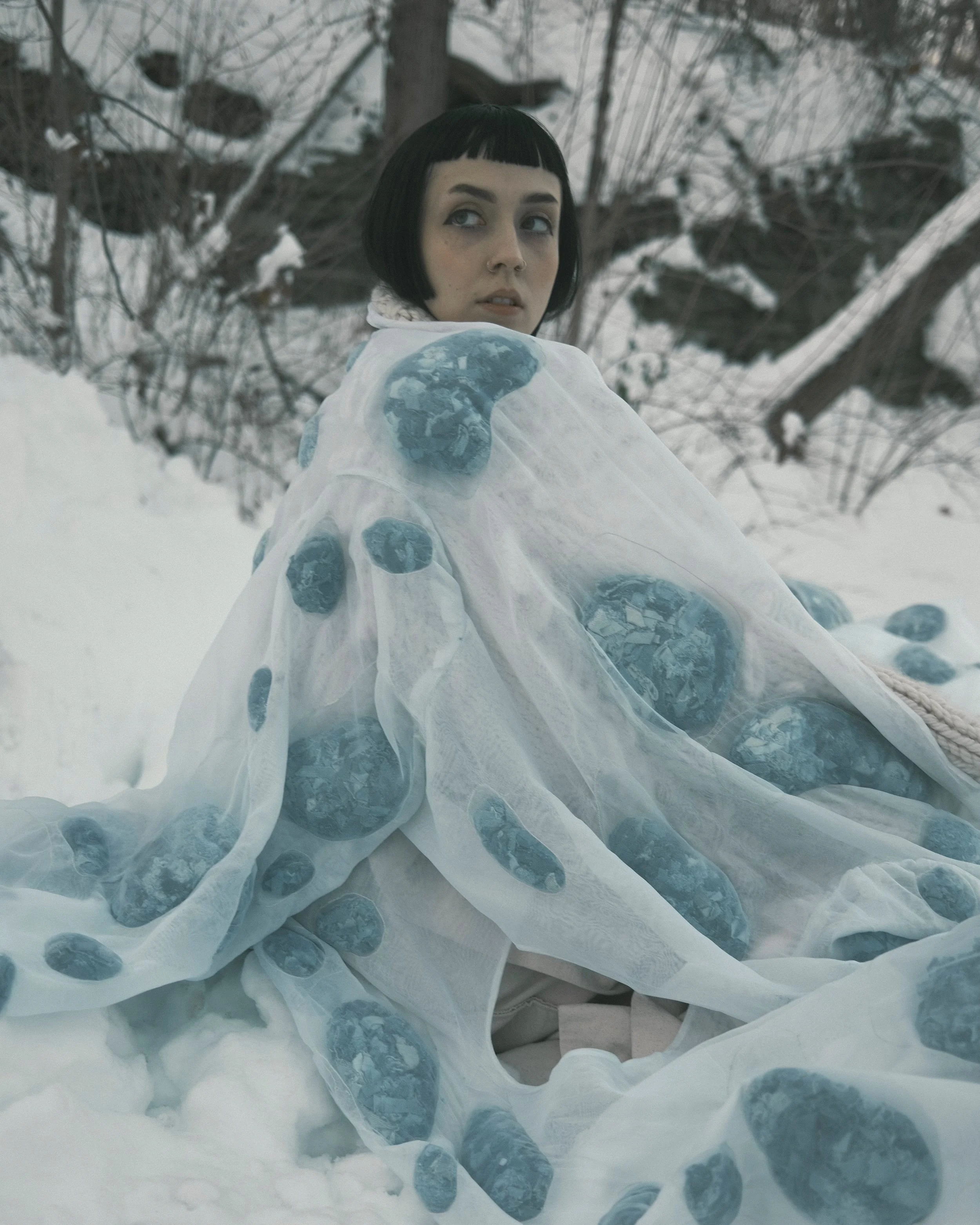 THE SCRAP PIECES WERE HAND CUT TO SMALLER FRAGMENTS TO FILL THE ORGANIC STONE-LIKE SHAPES SEWN INTO THE SILK. THESE GARMENTS FEATURE 4 FULL LENGTH SLEEVES AND 2 CIRCULAR OPENINGS, ALL CONTRIBUTING A MYRIAD OF VARIATIONS THE WEARER CAN EXPLORE IN THE COAGULATED SILK PUFFER.