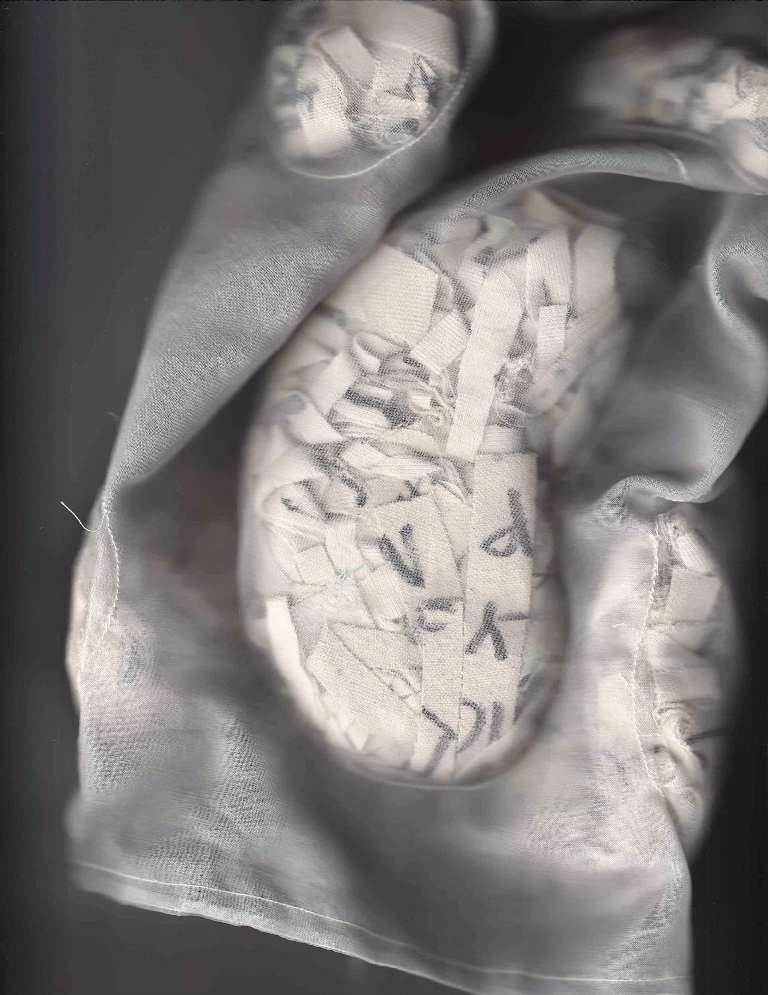 A TOTAL OF THREE COAGULATED GARMENTS WERE CONSTRUCTED FOR THIS PROJECT, EACH FEATURING A DIFFERENT COLOR-WAY. THE BLUE FEATURES THE FABRIC FRAGMENTS SATURATED IN NATURAL BLUE INDIGO DYE, THE GREY FEATURES THE FABRIC FRAGMENTS SATURATED IN NATURAL BLACK DYE USING LOGWOOD AND TANNINS, AND THE THIRD FEATURES FRAGMENTED TEXT CONTAINING ALL OF THE CONCEPTS AND IDEAS CONCEIVED FOR COLLECTION TWO WRITTEN DOWN/ DRAWN ONTO BY THE DESIGNER.