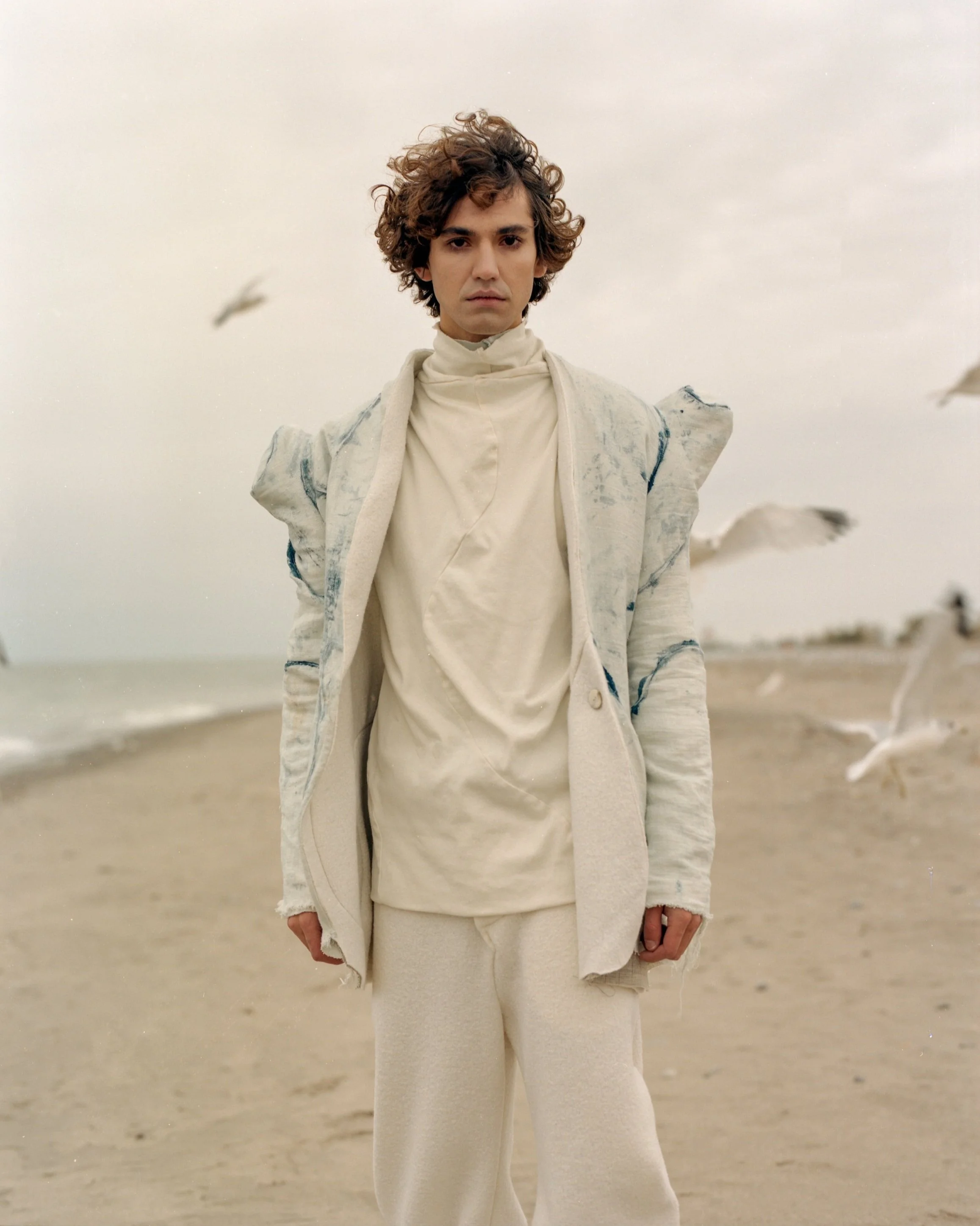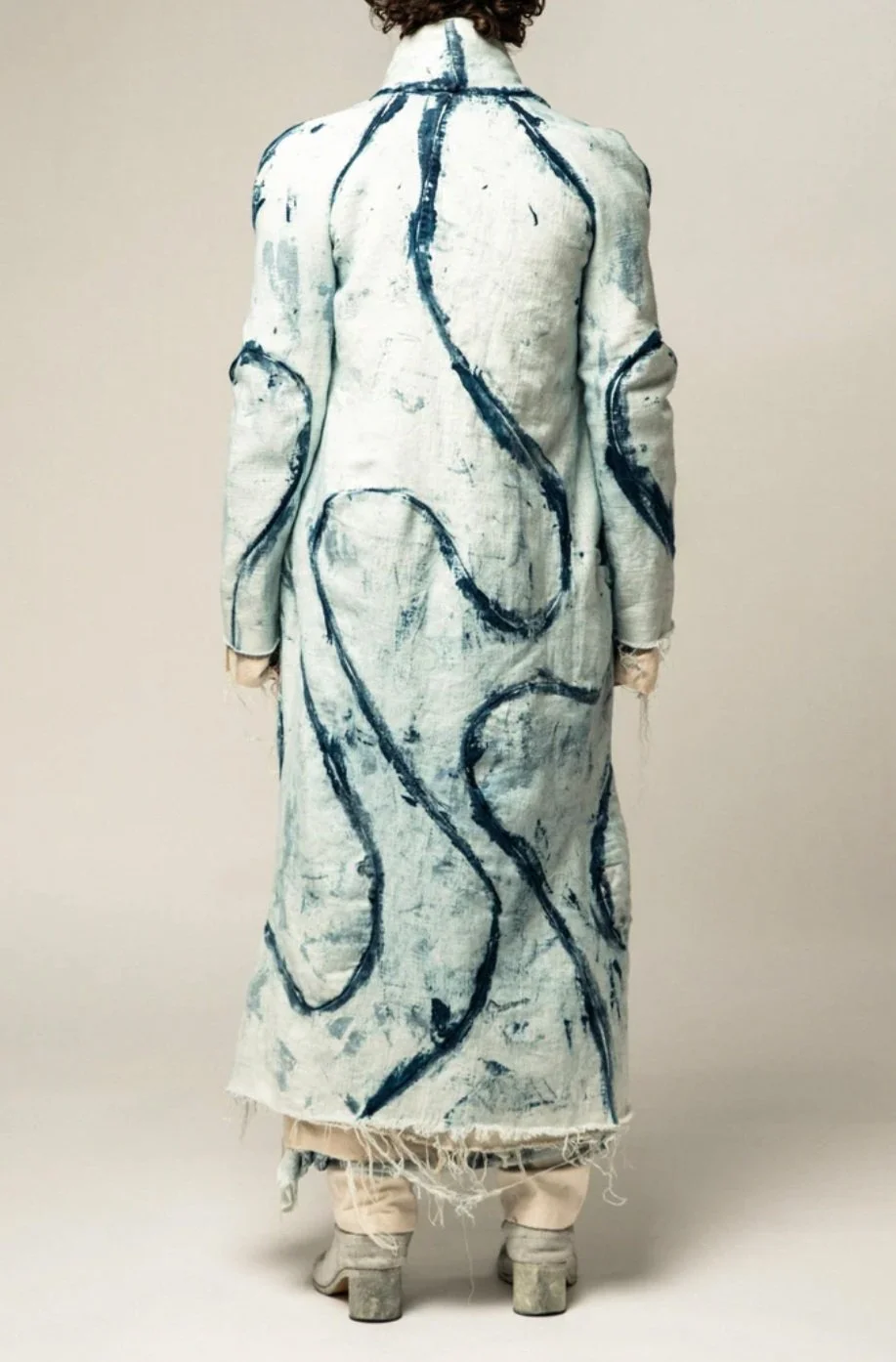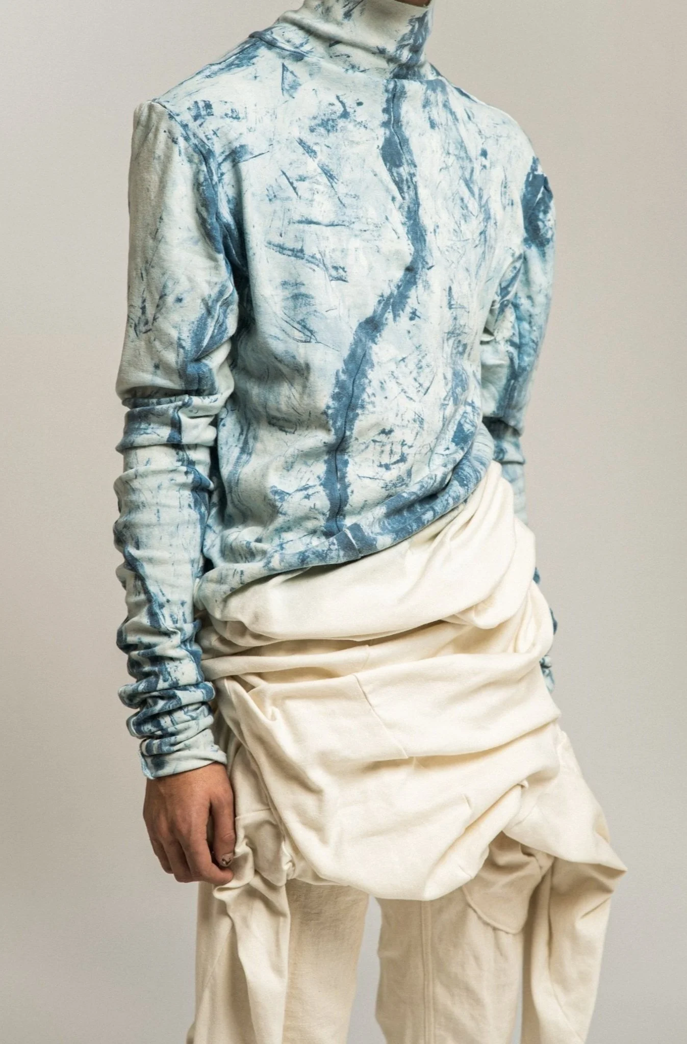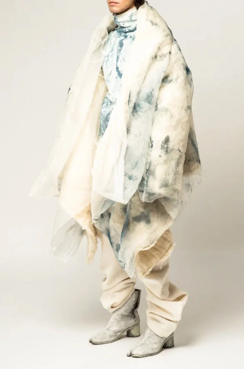 THE COLLECTION CONCLUDES BY FINALLY REVEALING THE BLUE COLOR-WAY, THAT SOLIDIFIES THE STRONG RELATION BETWEEN THE NATURAL ORGANIC ELEMENTS IN THE COLLECTION’S DESIGN, MATERIALS UTILIZED AND HUMANS CONNECTING BACK WITH NATURE. THE DYE PASTE IS COMPRISED OF NATURAL INDIGO POWDER, RESULTING IN A VIBRANCY OF BLUE THAT EVOKES A CALM FEELING WITHIN THE WEARER. THE DYE APPLICATION METHOD RESULTS IN A WATER LIKE QUALITY OR THAT OF A BLUE SKY ADORNED WITH CLOUDS.