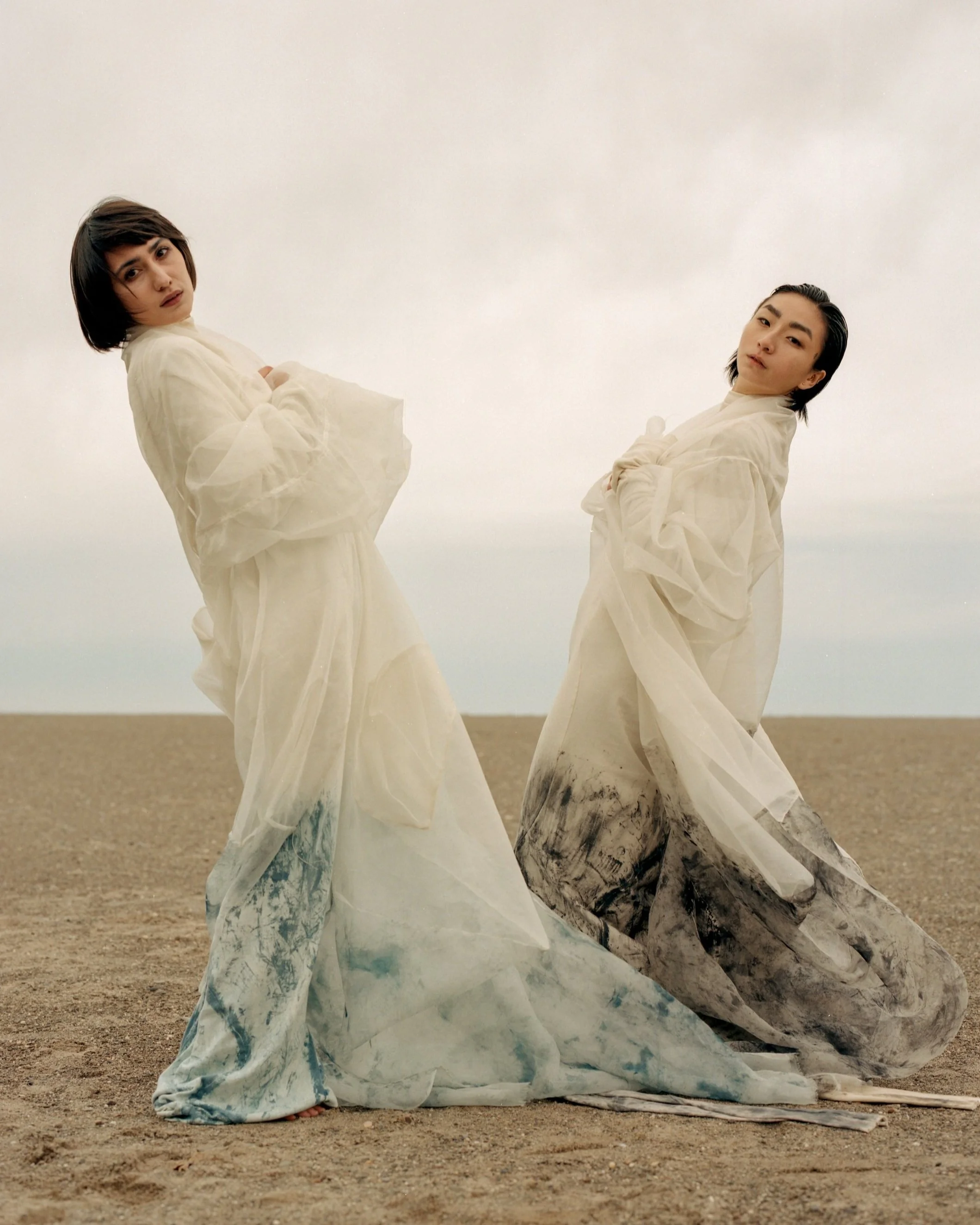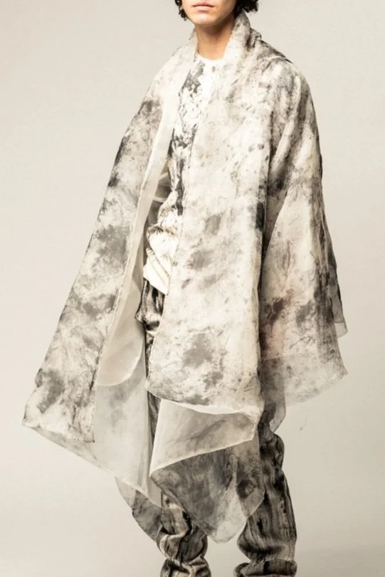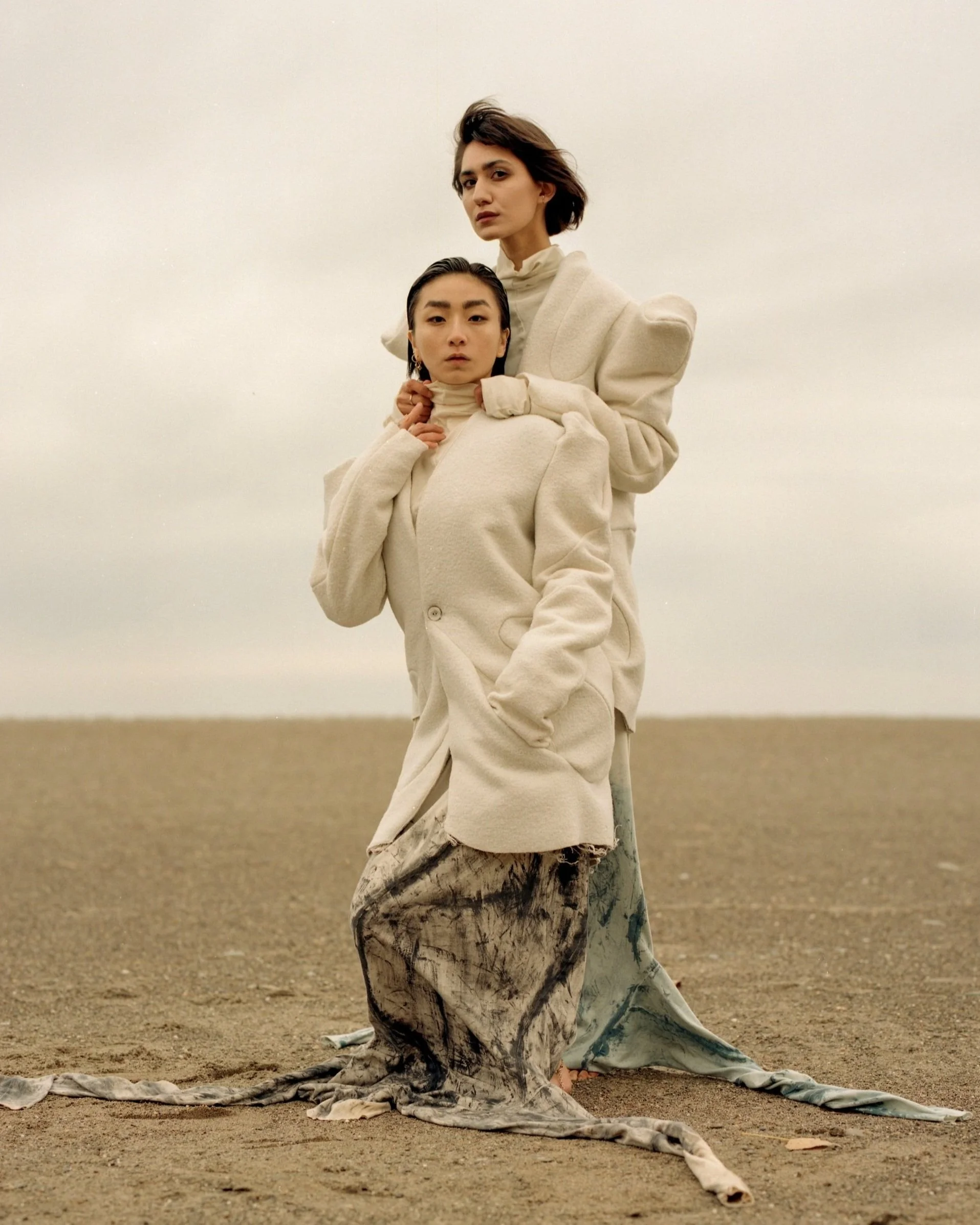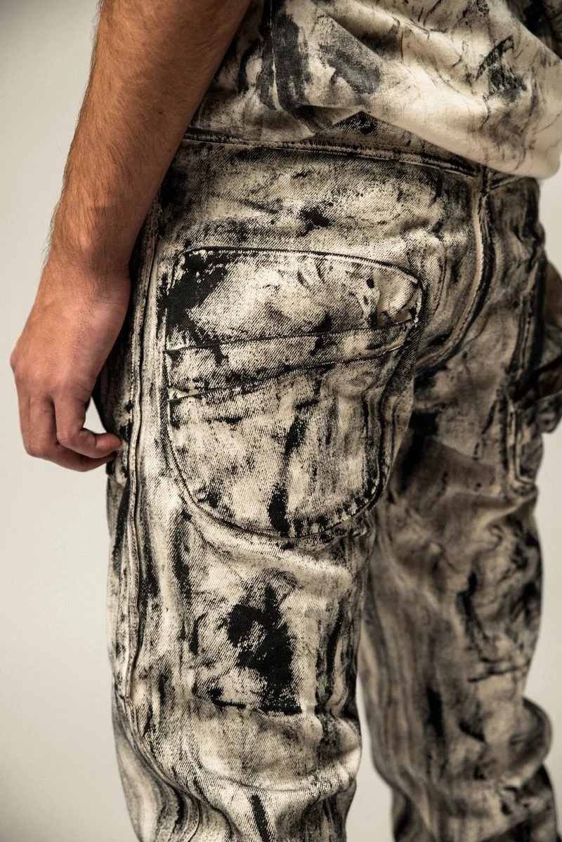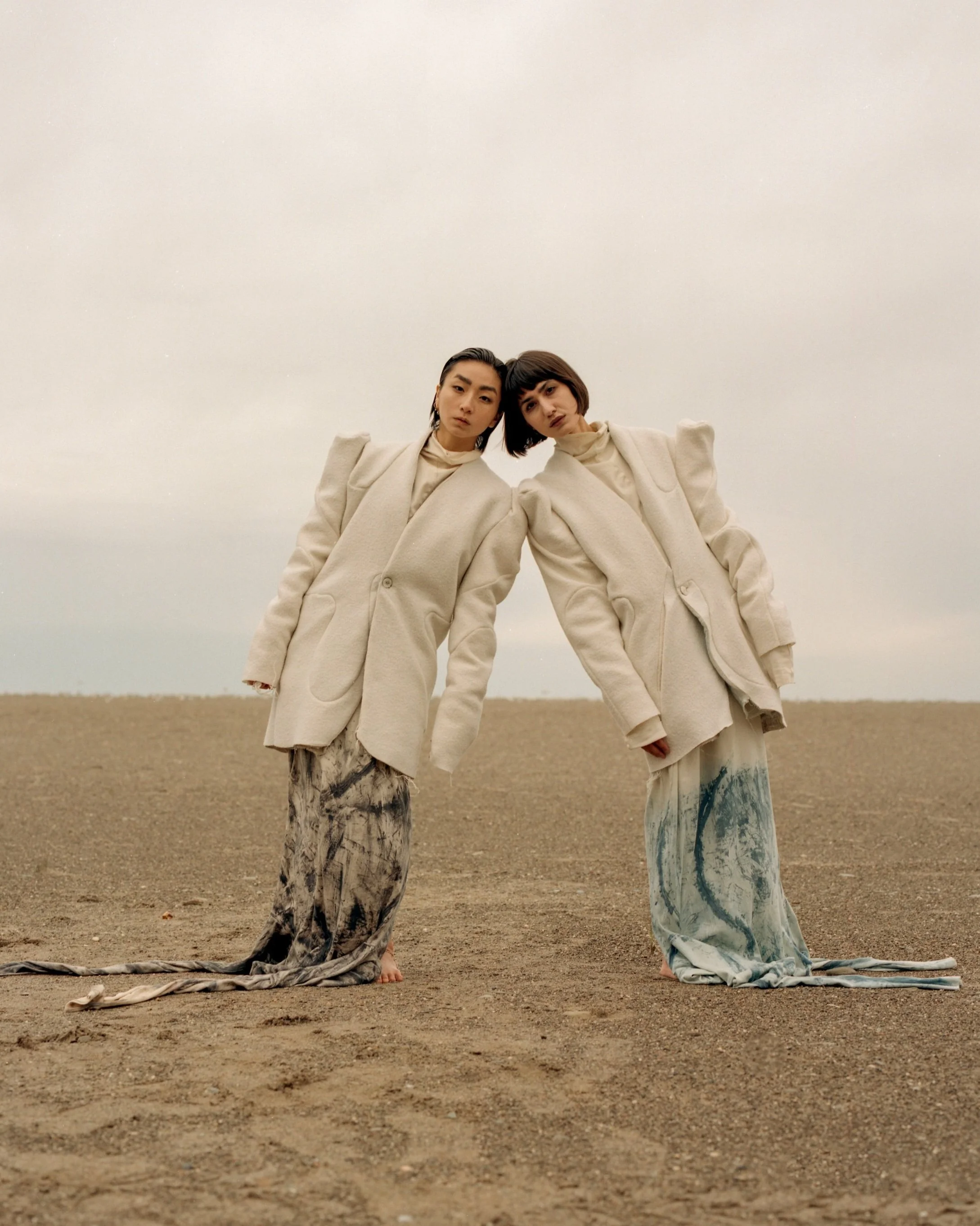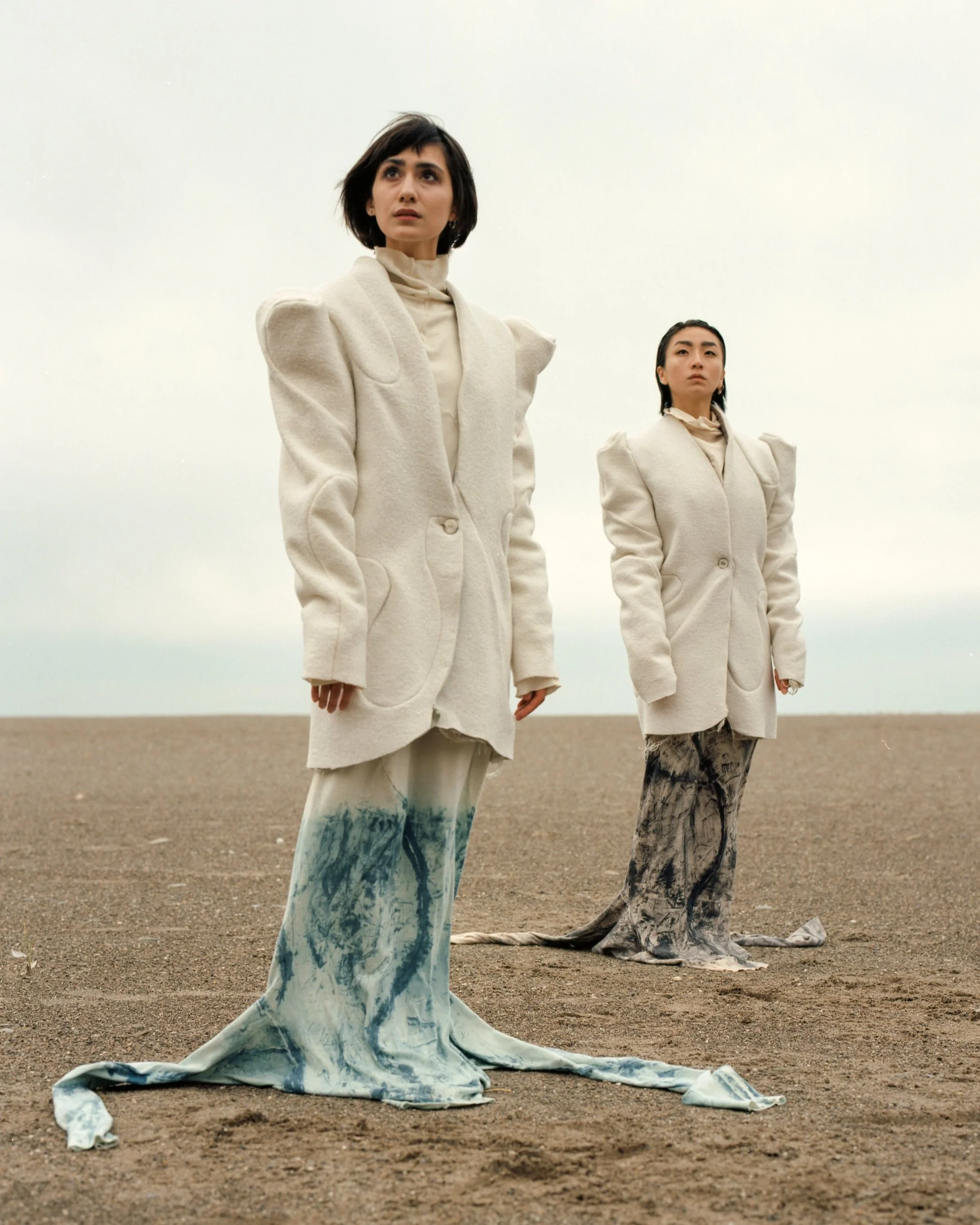 AS A STARK CONTRAST TO THE UNDYED SIDE OF THE GARMENTS, THE COLLECTION VENTURES INTO THE SHADOWS, INTRODUCING THE BLACK SIDE OF THE GARMENTS THAT EMBODY THE DUALITY OF LIFE. THE HAND-PAINTED BRUSH STROKES COMPRISED OF AN ALGAE BASED DYE PASTE, MIMIC TREE BARK, SHIFT THE OVERALL FOCUS FROM THE SMALL DETAILS, TO THE OUTFITS AS A WHOLE.