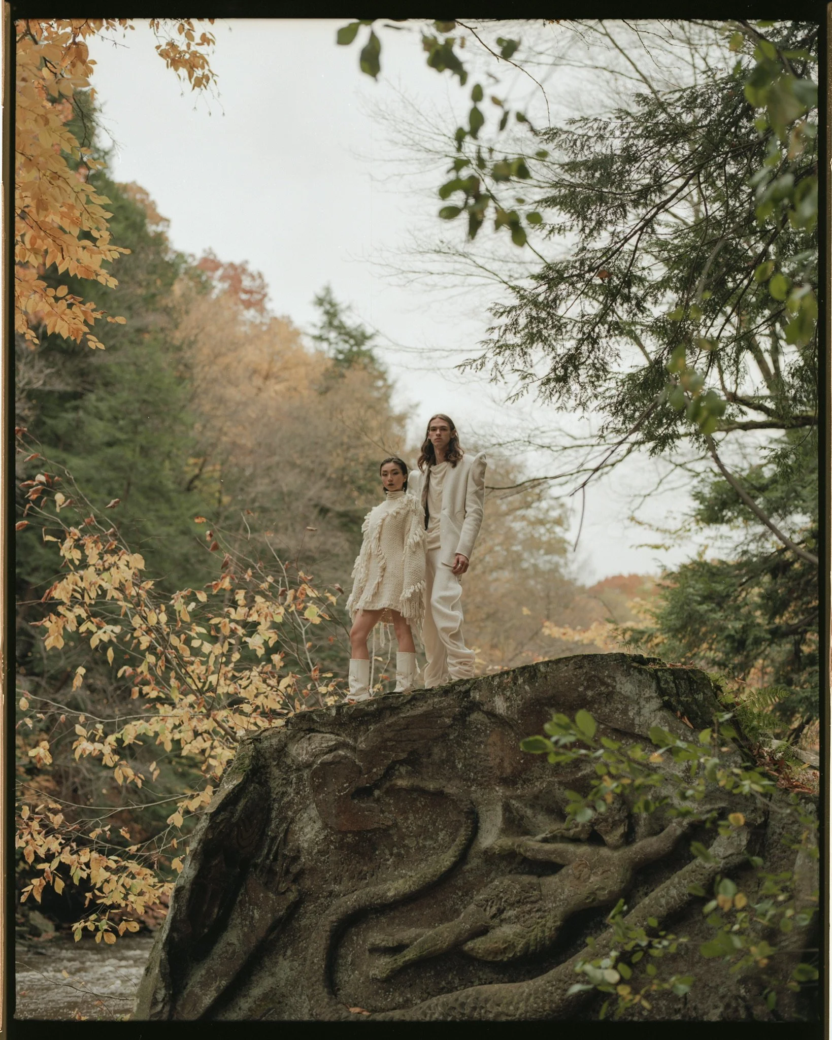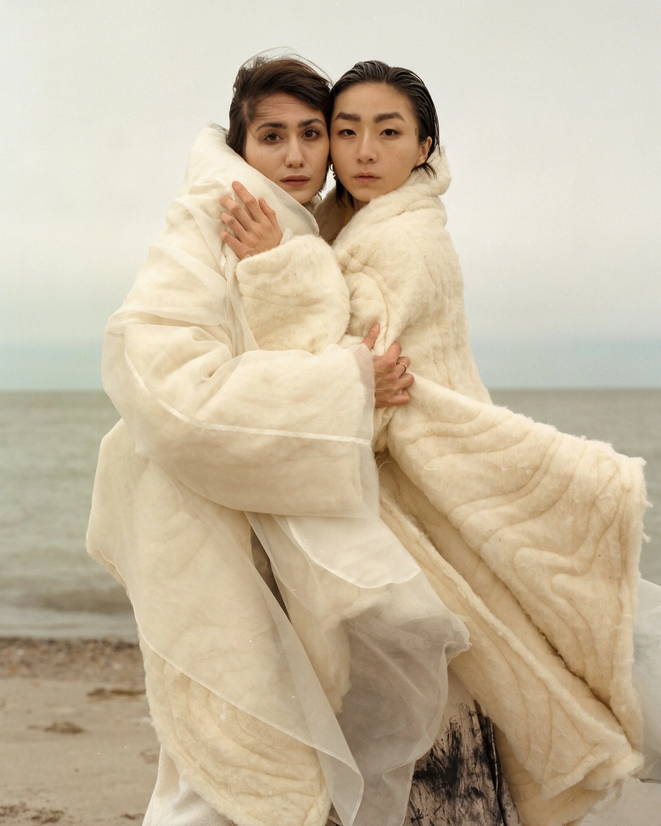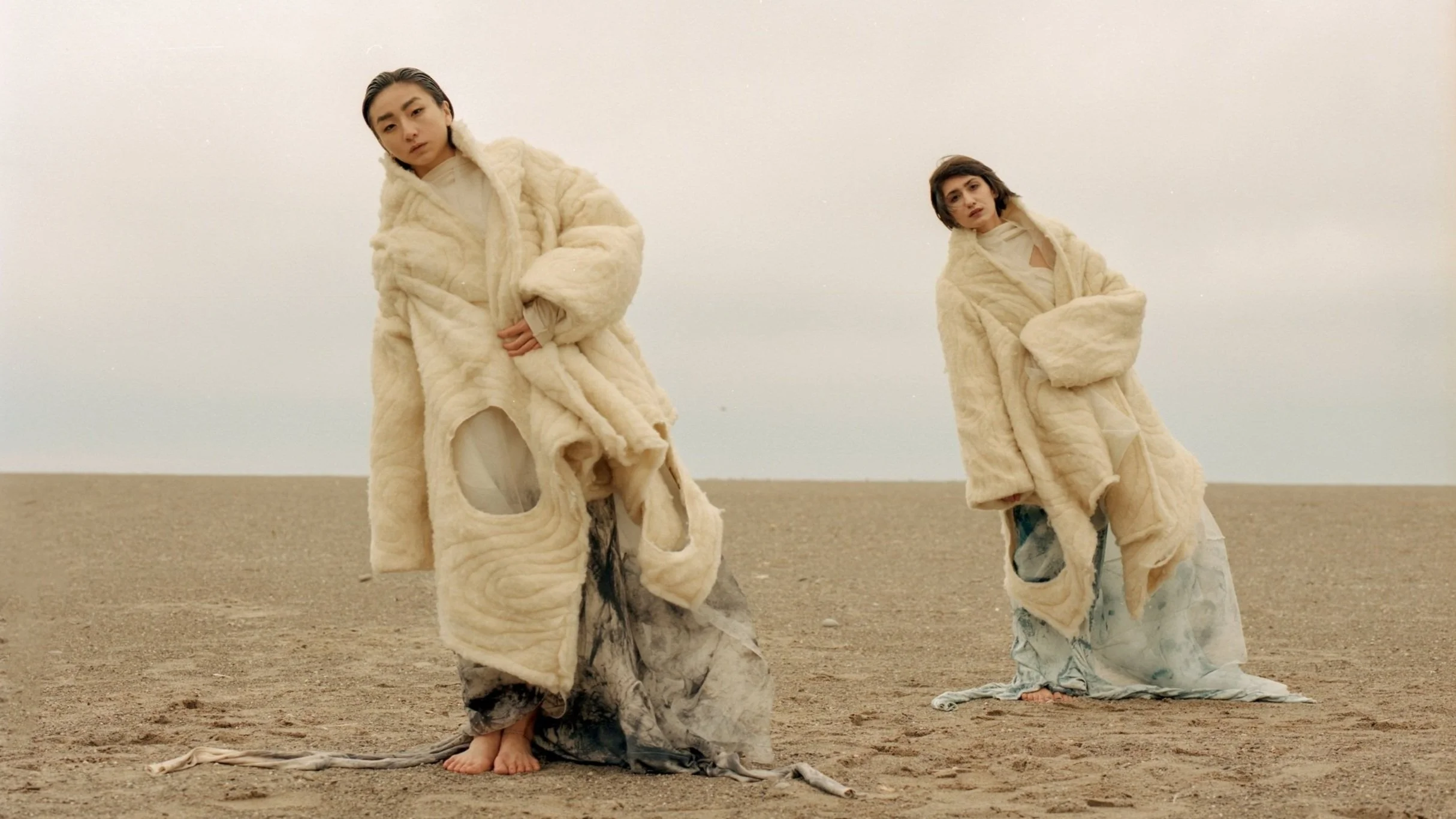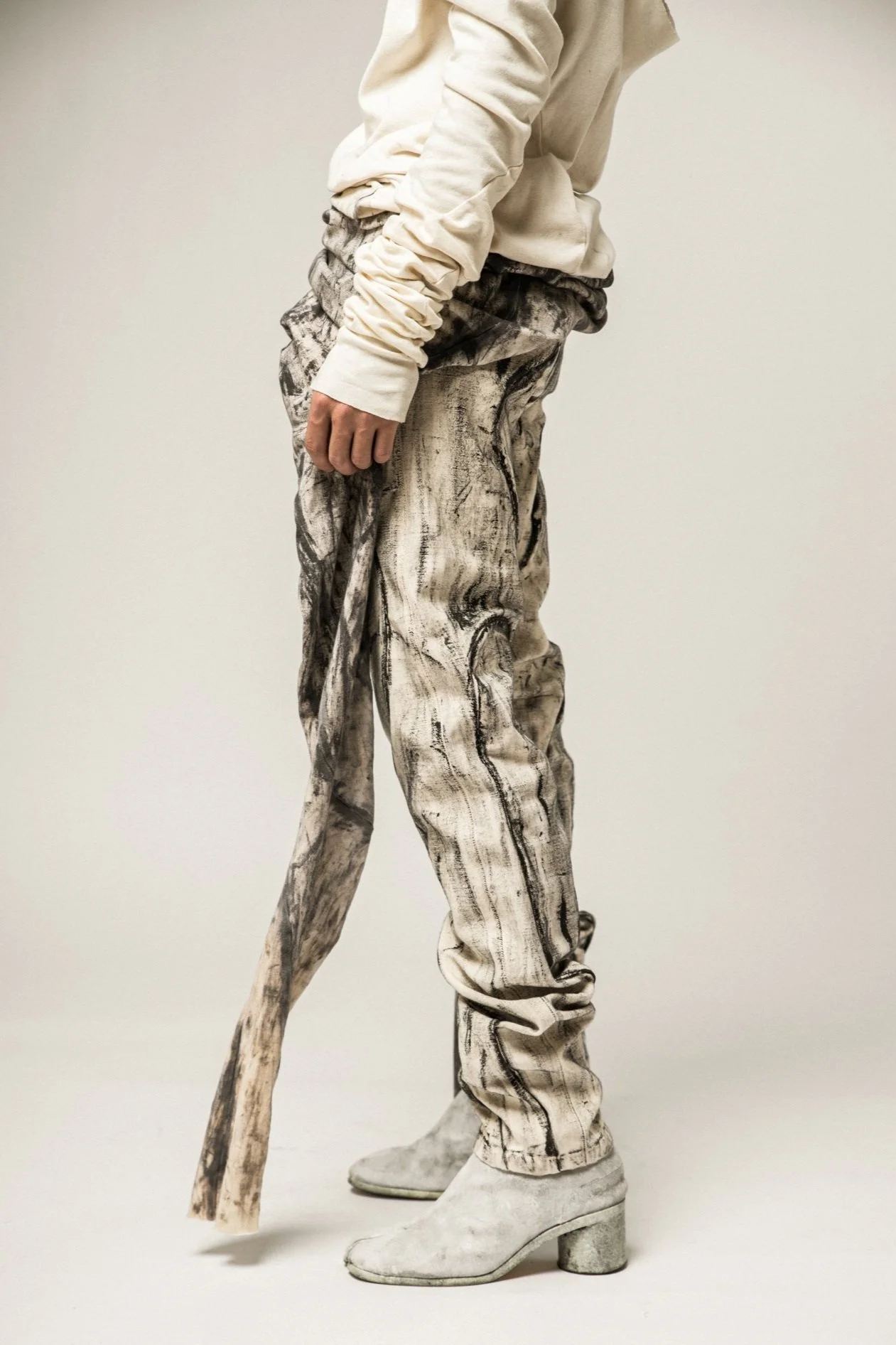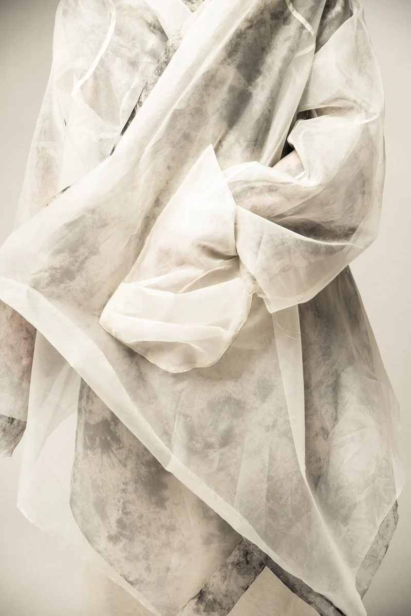 AS A STARK CONTRAST TO THE UNDYED SIDE OF THE GARMENTS, THE COLLECTION VENTURES INTO THE SHADOWS, INTRODUCING THE BLACK SIDE OF THE GARMENTS THAT EMBODY THE DUALITY OF LIFE. THE HAND-PAINTED BRUSH STROKES COMPRISED OF AN ALGAE BASED DYE PASTE, MIMIC TREE BARK, SHIFT THE OVERALL FOCUS FROM THE SMALL DETAILS, TO THE OUTFITS AS A WHOLE.