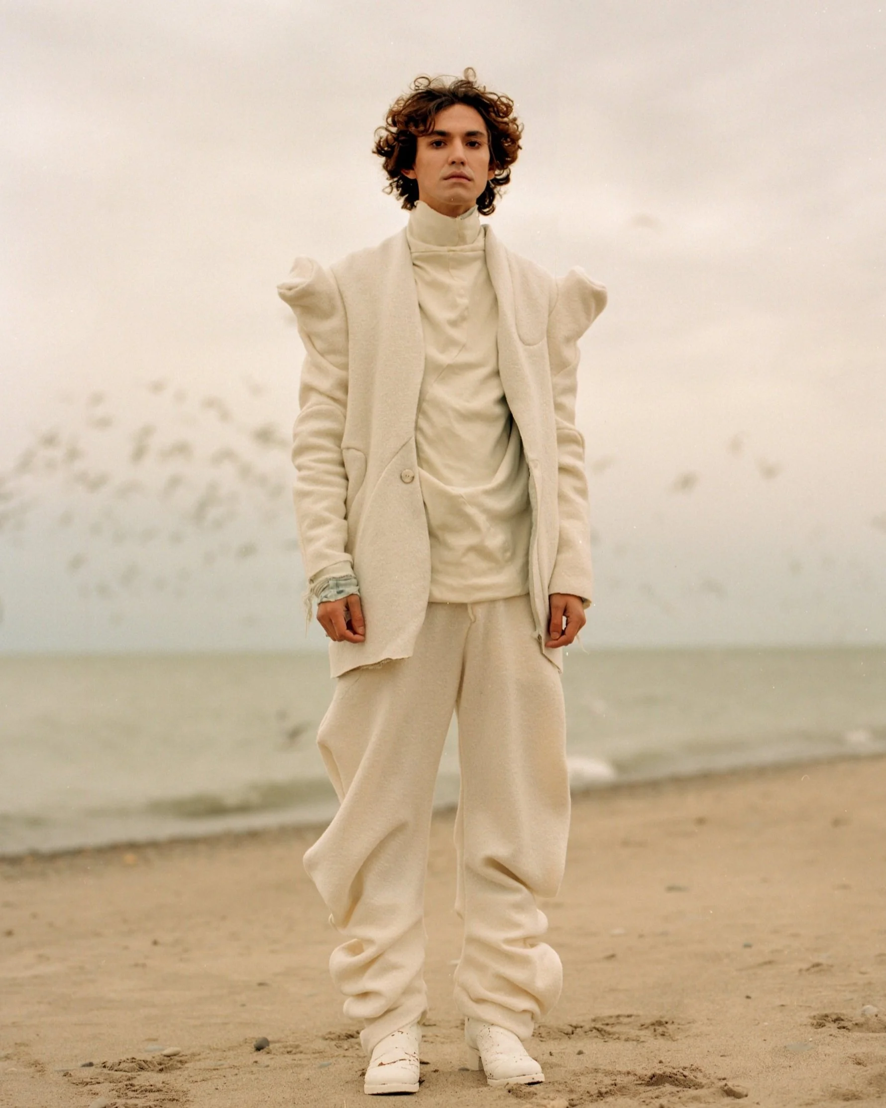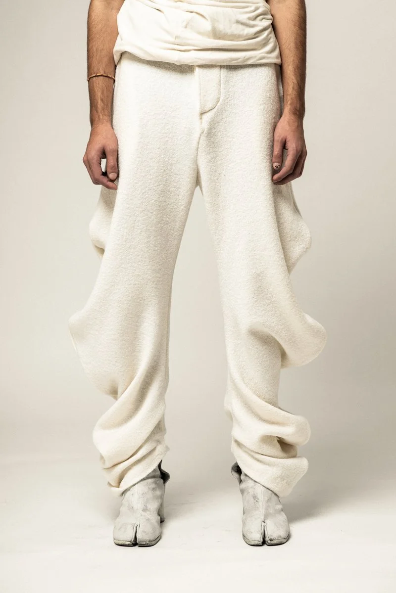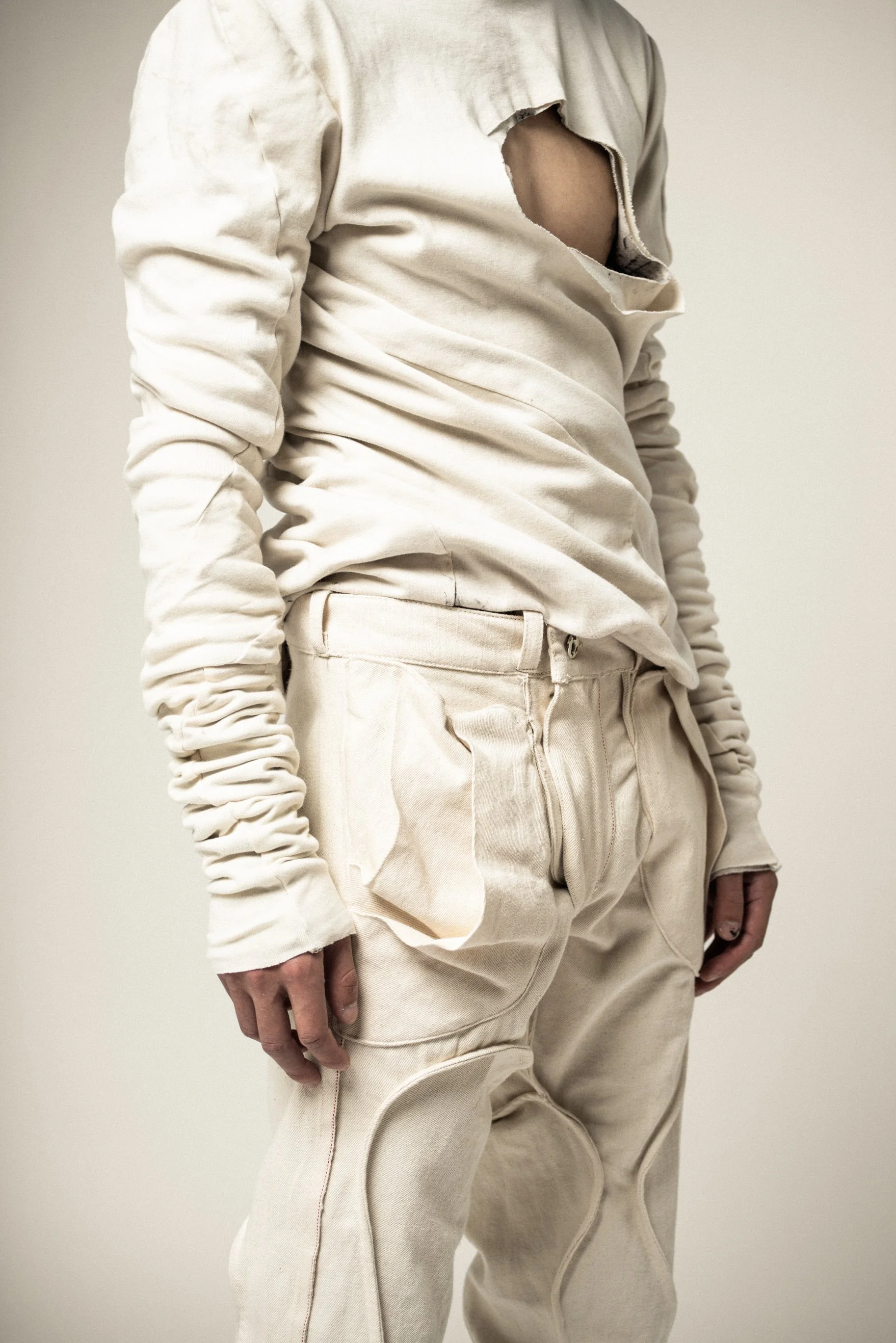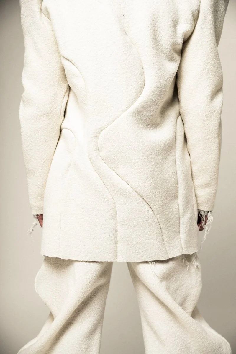 THESE GARMENTS WERE DESIGNED TO HAVE A SOFTER, MORE ETHEREAL UNDERLYING TONE, SYMBOLIZING THE EMBRYONIC PHASE FROM WHICH THE GARMENTS EVOLVE FROM. EVERY GARMENT IN THIS COLLECTION FEATURES THIS INITIAL COLOR ON ONE SIDE, ALLOWING THE WEARER TO EXPERIENCE A FULLY MONOCHROMATIC WARDROBE, DESIGNED WITH THE INTENTION OF DISPLAYING THE PURE ORGANIC FORMS AND INTRICATE SEAM WORK, TRANSPOSING THE WEARER INTO A SCULPTURE FORM, BRINGING THESE DESIGN ELEMENTS TO LIFE.